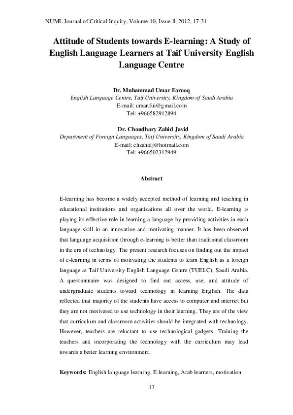 Pdf Attitude Of Students Towards E Learning A Study Of English Language Learners At Taif University English Language Centre Prof Dr Choudhary Z A H I D Javid And Muhammad U Farooq Academia Edu