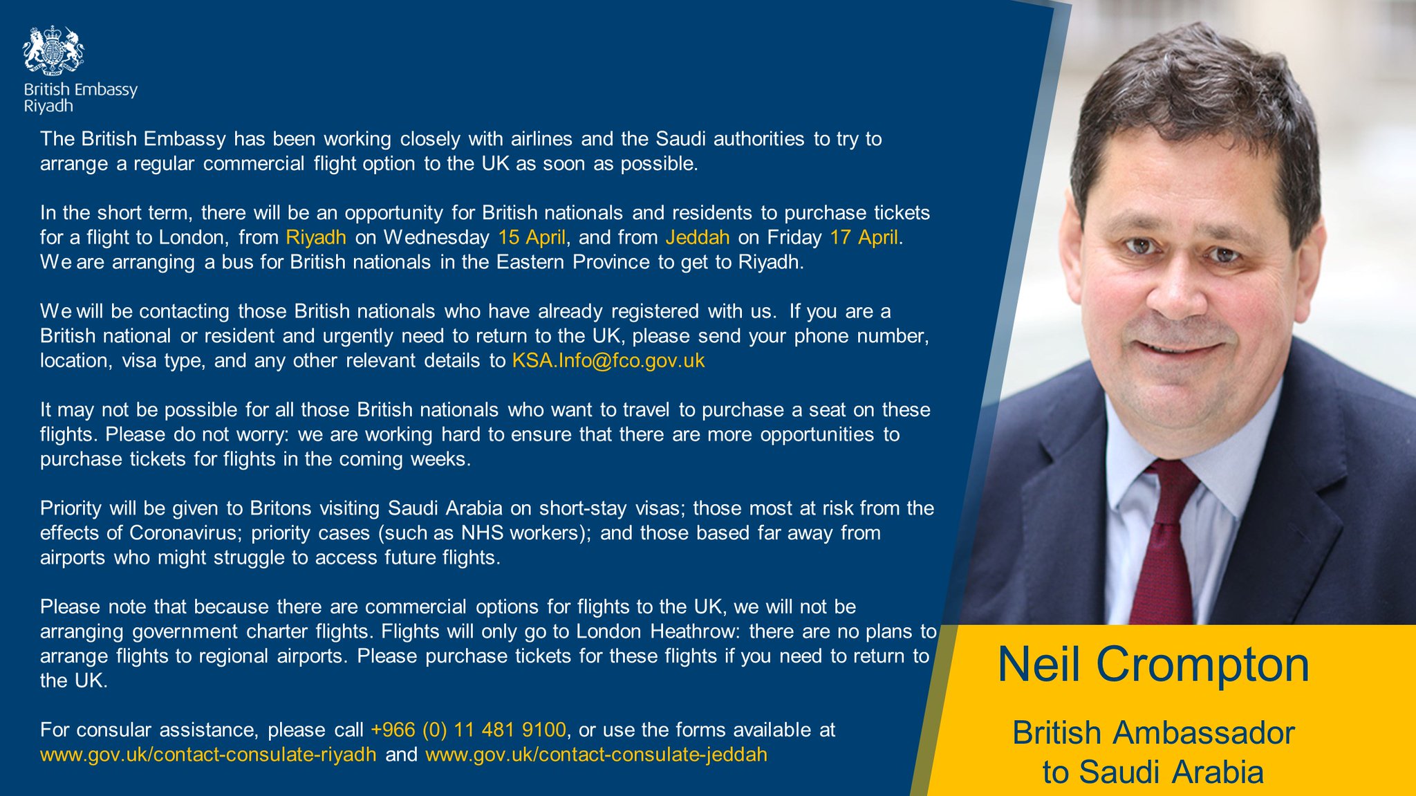 Ukinsaudiarabia On Twitter Update From The British Ambassador Ukambksa Regarding Flights For British Nationals And Residents In Saudi Arabia Who Urgently Need To Return To The Uk Britsinksa Https T Co G66is7m1cm